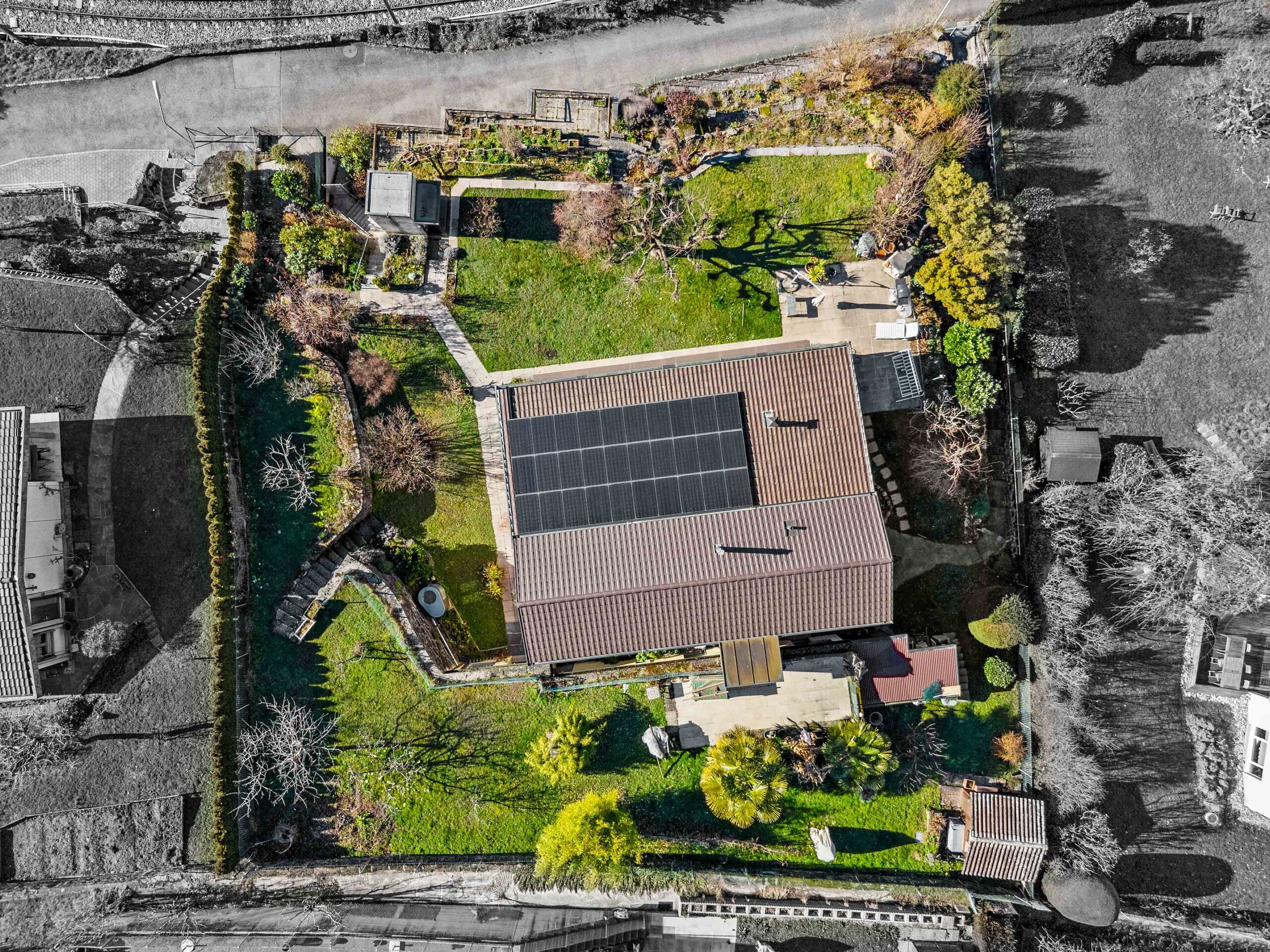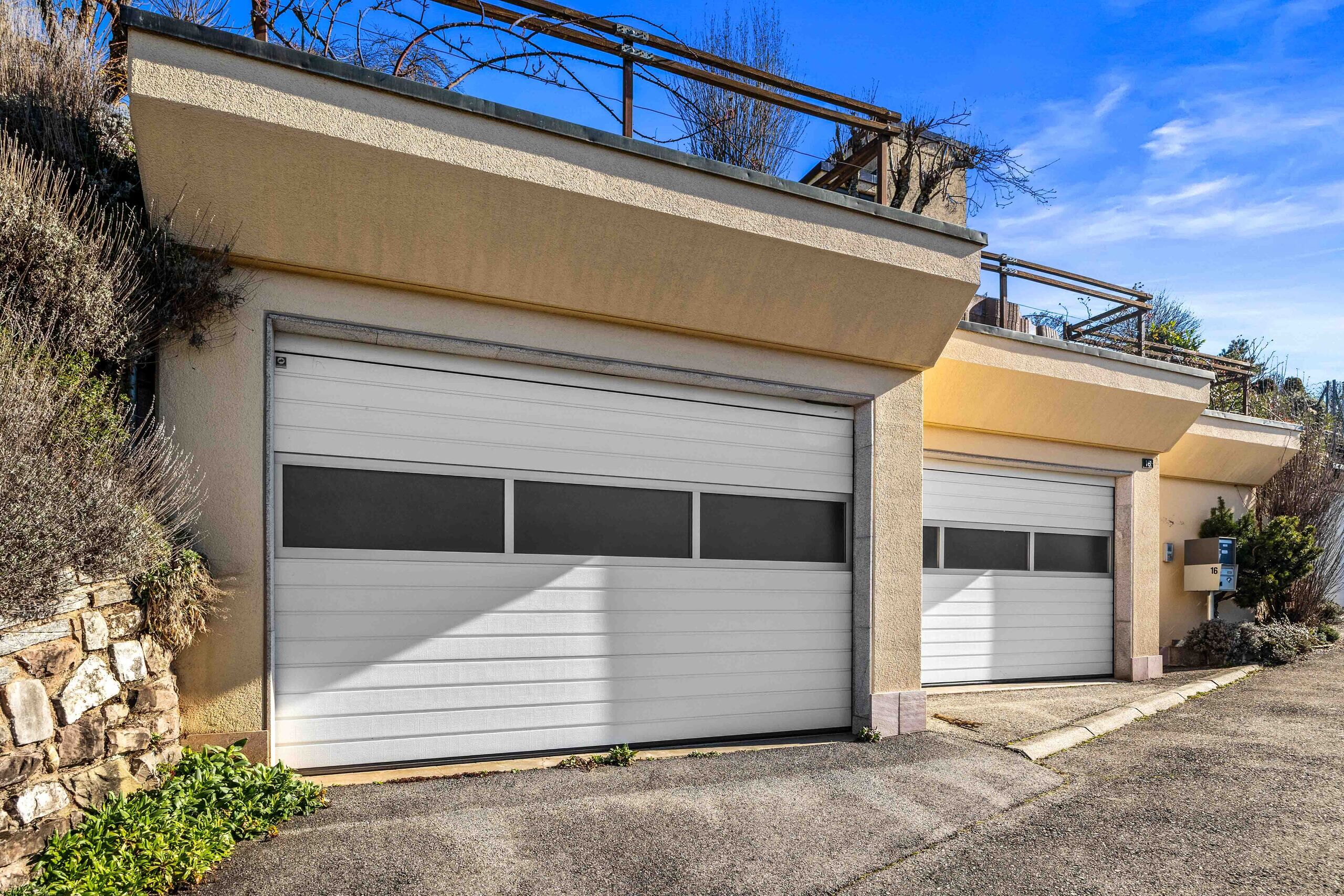 Eine große Doppelgarage mit Aufzug zum Gartengeschoss sowie eine einfache Garagenbox vervollständigen diese Immobilie.